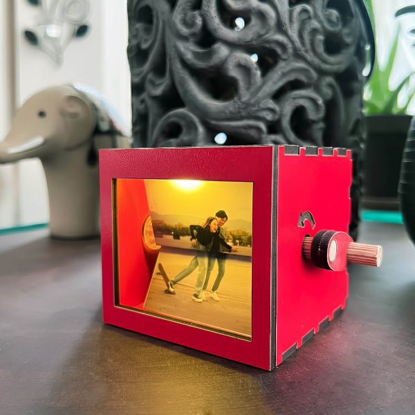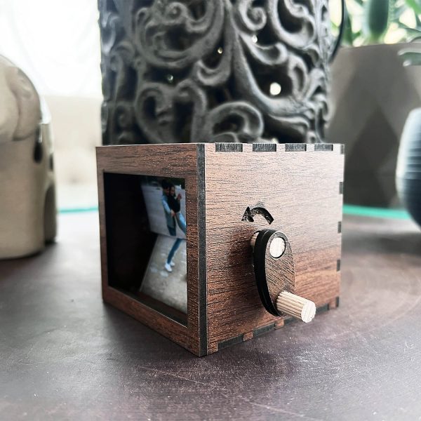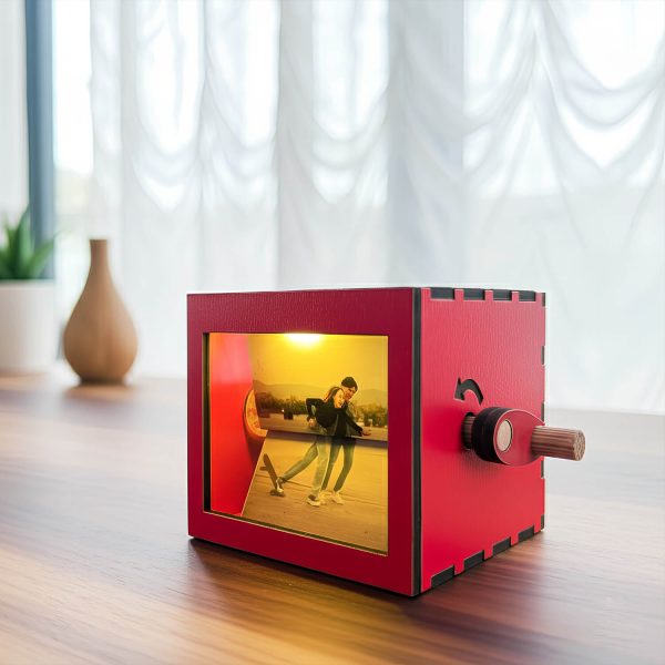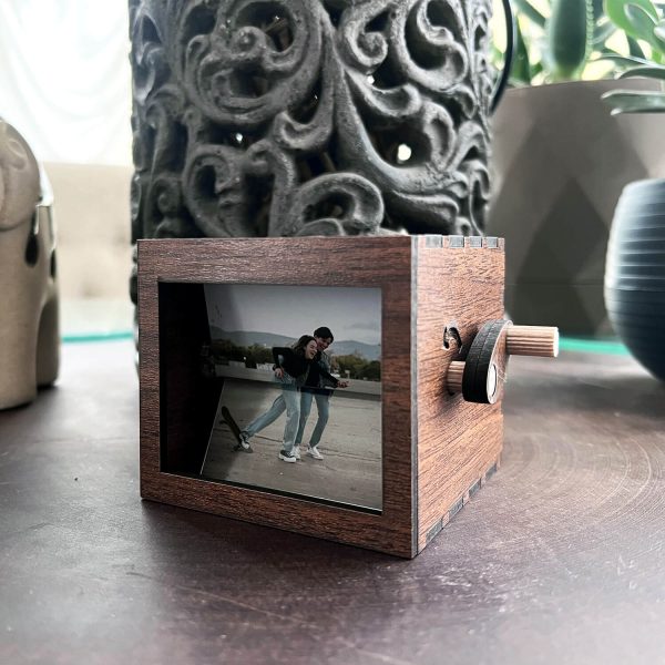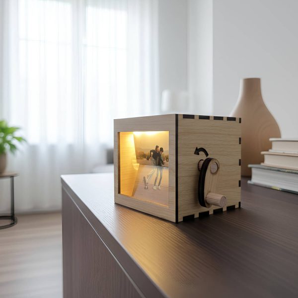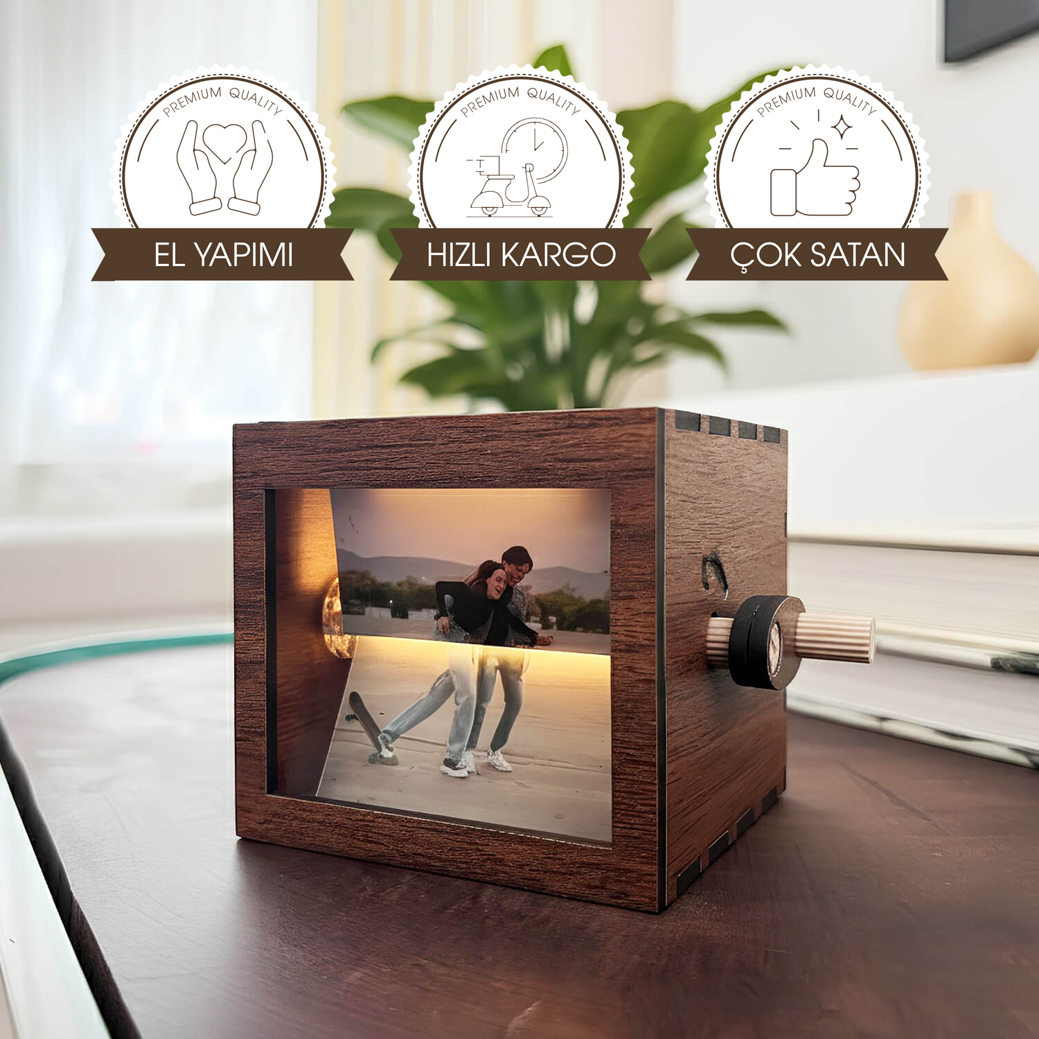 Seçtiğiniz 8 veya 16 özel fotoğraf, el yapımı ceviz ahşap kutuda dönerek her açıdan sizi karşılıyor. Her bakışta başka bir an, her dönüşte başka bir hikâye. Üstelik ışıklı!